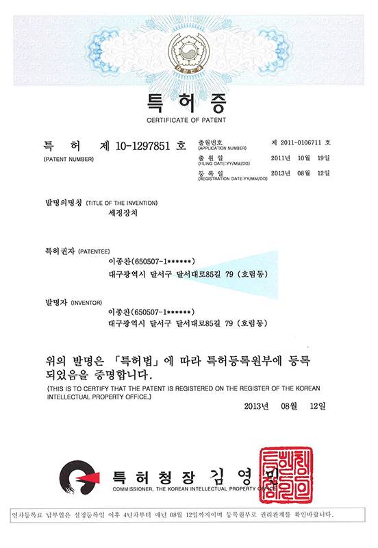 세정기 특허증
